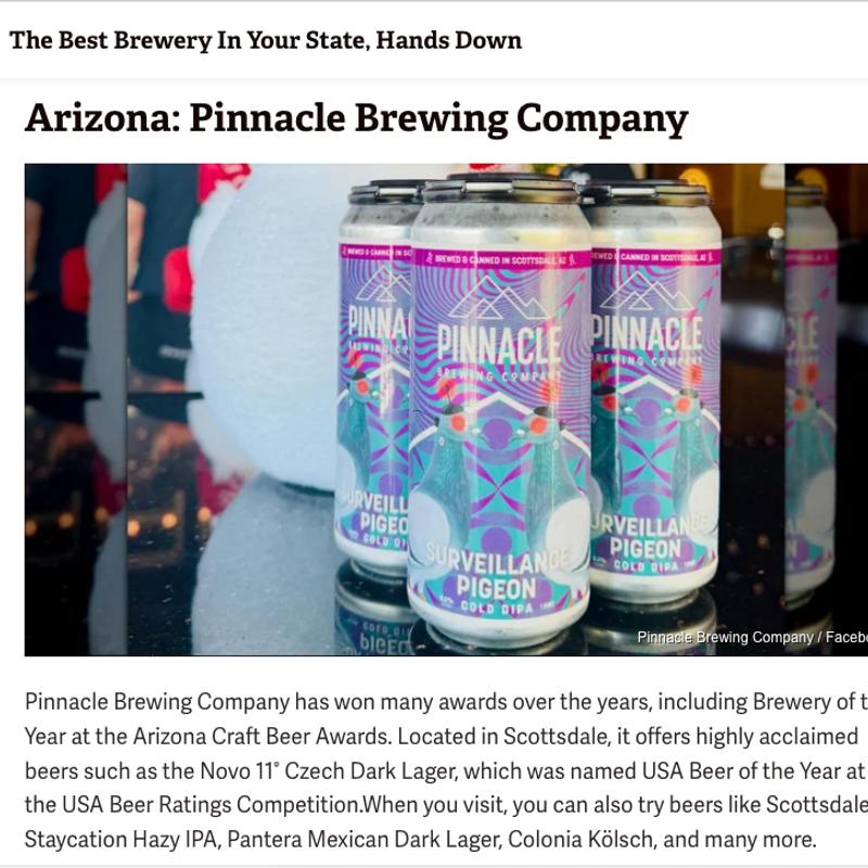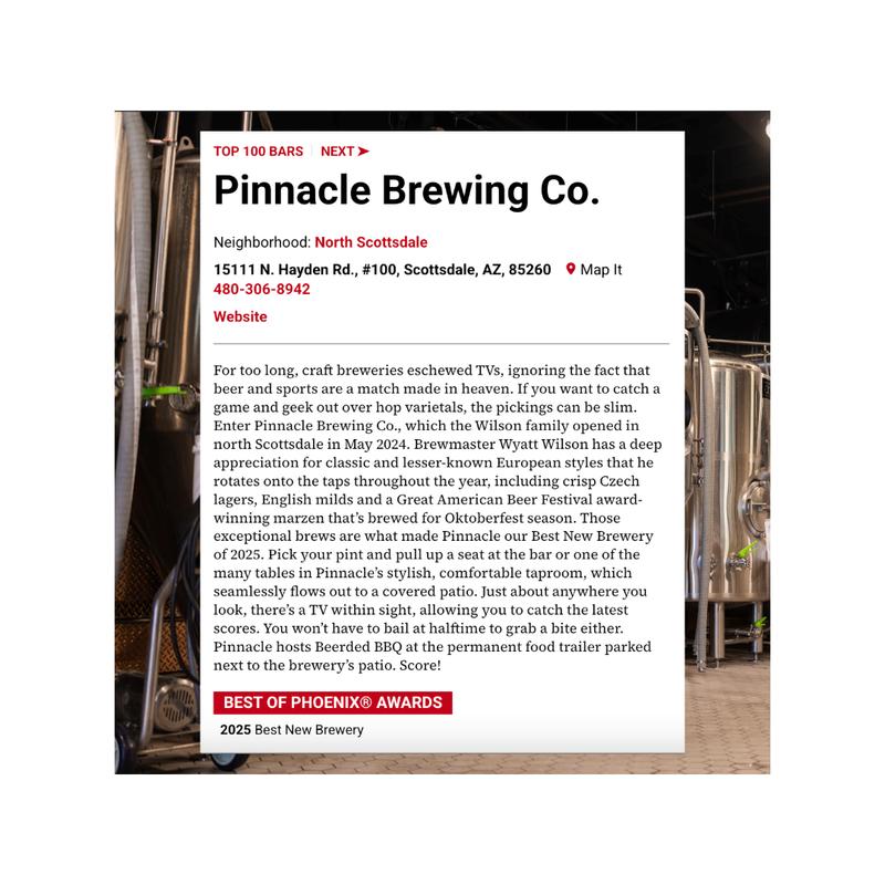 Book now a private partyPinnacle Brewing Company is hands-down one of my favorite spots in Scottsdale, their beers are brewed with care and range from crisp lagers to bold stouts, each sip feeling fresh and thoughtfully crafted. The atmosphere is relaxed and welcoming, with a comfy taproom, a spacious dog-friendly patio, and a welcoming vibe that makes it great for meetups or chill evenings. Add in rotating food trucks and friendly staff who really know their beer, and you’ve got an ideal place to unwind. Whether you’re a craft-beer aficionado or just looking for a laid-back spot to grab a pint, Pinnacle delivers again and again.